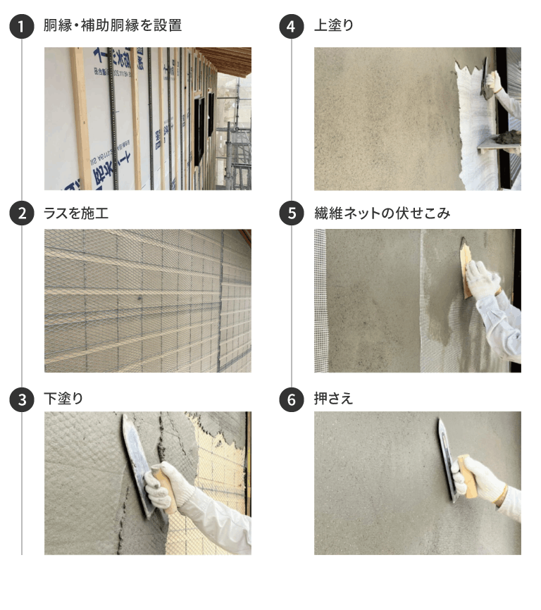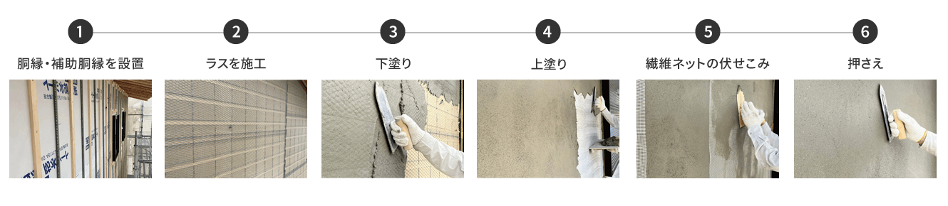 胴縁上に面材、防水紙、ラスを張付けてモルタルを塗布する工法。