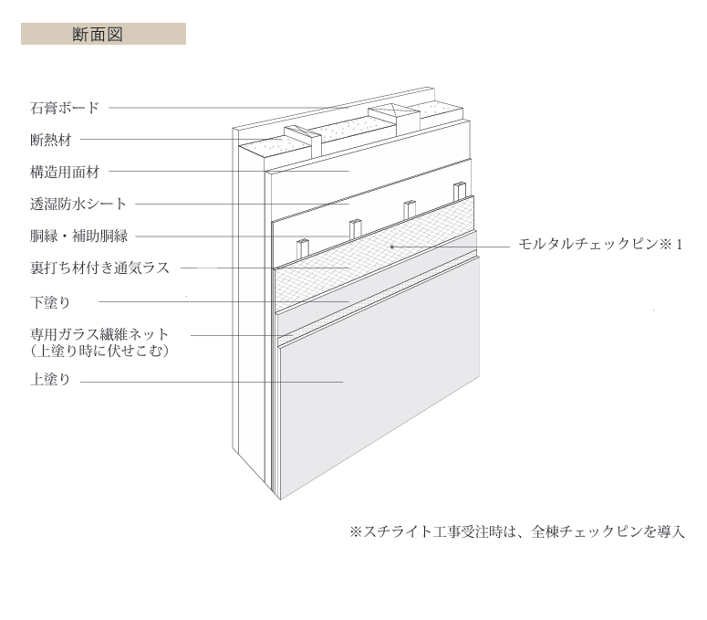 スチライト工業が提案する既調合軽量セメントモルタルを使用した胴縁通気工法です。
